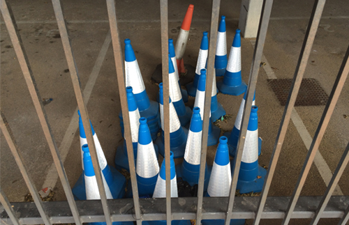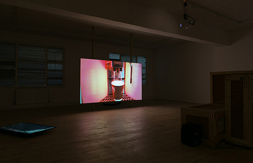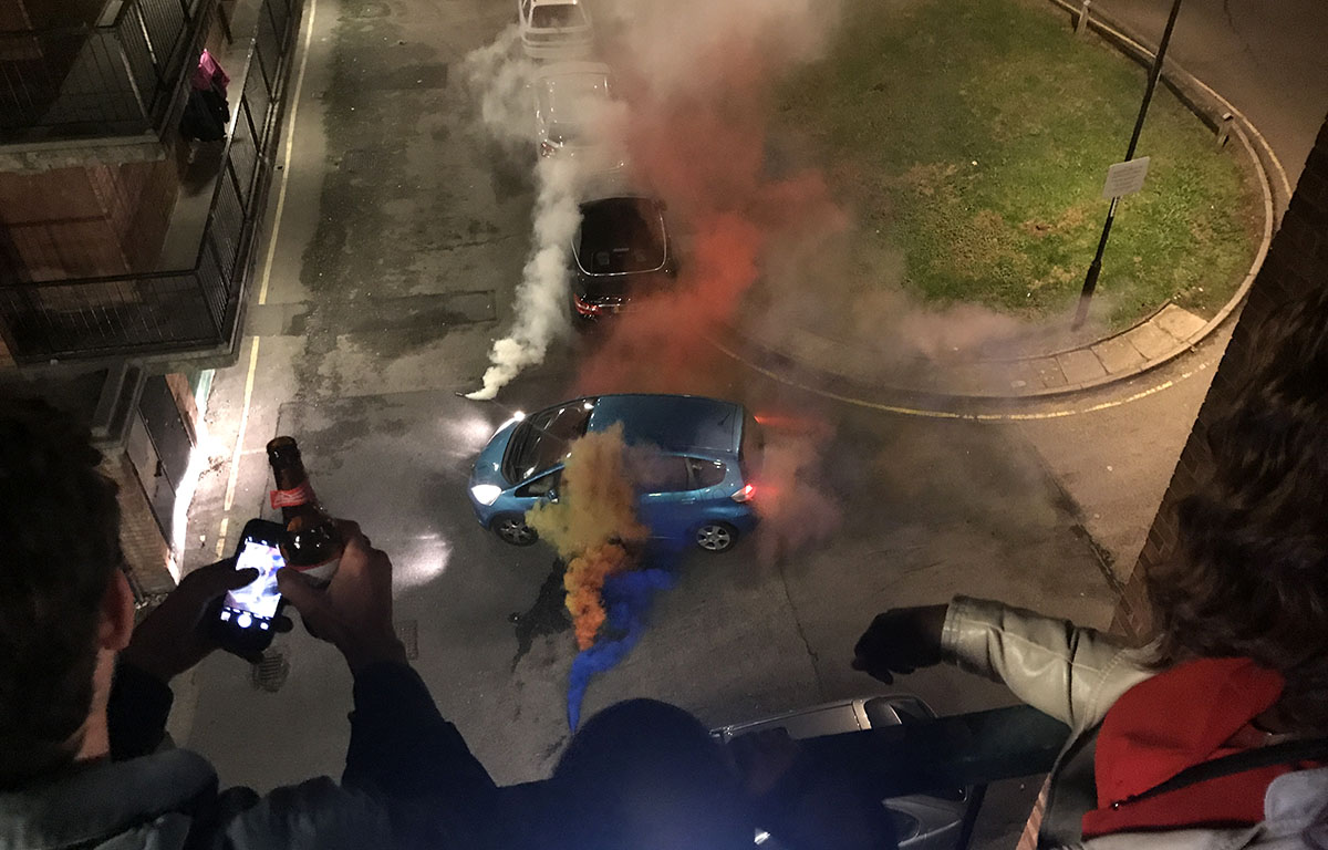 A car’s headlights are left on as it sits in the middle of the estate filling and billowing with red smoke. Operatic score projects from the top floor walkway. “If I rub my hand along the wall, how much friction will there be?” questions Ewe to an estate agent. More and more, it feels.